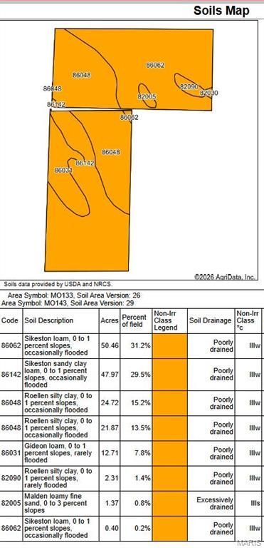 This productive row crop farm, spanning approximately 160+/- acres across the New Madrid and Mississippi County line in Missouri, represents a quality agricultural asset. The farm is fully equipped for consistent production, featuring one electric center pivot serviced by a high capacity well, ensuring water and yield stability regardless of seasonal rainfall. Its location in the heart of the Missouri Bootheel provides access to some of the most fertile alluvial soils in the state, making it ideal for a diverse rotation of corn, soybeans, or cotton. Farm is located on New Madrid County Road 706.There are 4 additional farms available for purchase ranging from 100 acres to 460 acres totaling an additional 1,180 acres.